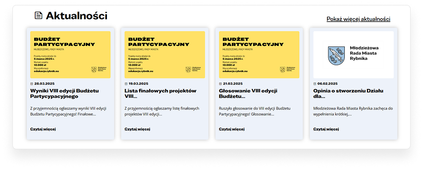 Nasza platforma to sprawdzone i elastyczne rozwiązanie, które doskonale wpisuje się w potrzeby Młodzieżowych Rad Miast, służąc jako ich oficjalne cyfrowe centrum komunikacji i aktywności. Przykładem efektywnego wykorzystania naszego systemu jest portal Młodzieżowej Rady Miasta Rybnika (mrm.miastorybnik.pl), który stał się dynamicznym narzędziem angażowania młodzieży i transparentnego informowania o działaniach Rady.